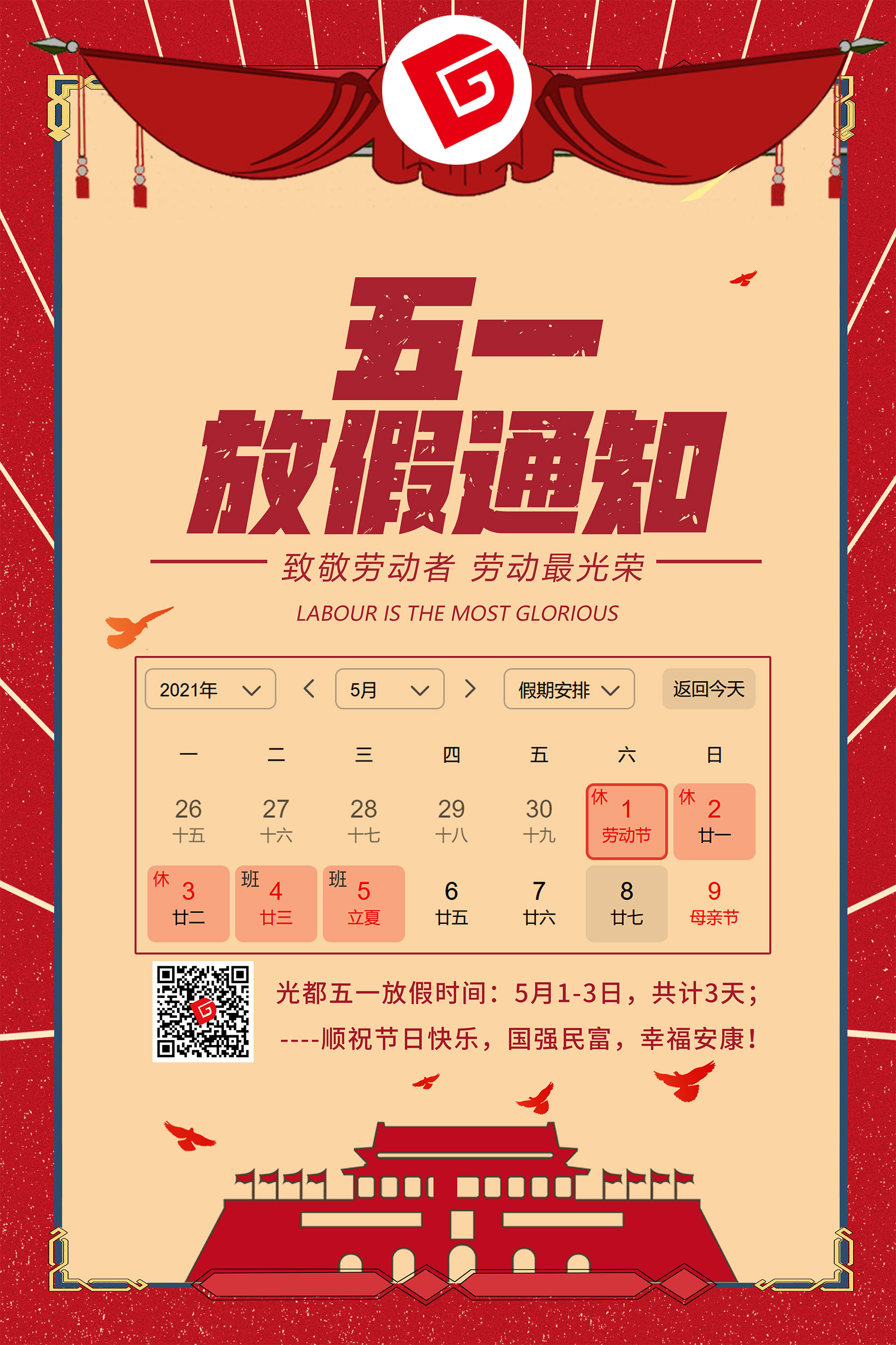 注:国际劳动节又称“五一国际劳动节”(International Workers' Day),是世界上100多个国家的全国性节日。定在每年的五月一日。它是全世界劳动人民共同拥有的节日。新中国成立以后,中央人民政府政务院于1949年12月将5月1日定为法定的劳动节,全国放假一天。每年的这一天,举国欢庆,人们换上节日的盛装,兴高采烈地聚集在公园、剧院、广场,参加各种庆祝集会或文体娱乐活动,并对有突出贡献的劳动者进行表彰。1999年9月18日,中国国务院发布《国务院关于修改〈全国年节及纪念日放假办法〉的决定》,第一次修订了1949年12月23日中国政务院发布的《全国年节及纪念日放假办法》,将每年春节、“五一”和国庆节法定节日加上调休,全国放假7天,形成了3个“黄金周”。