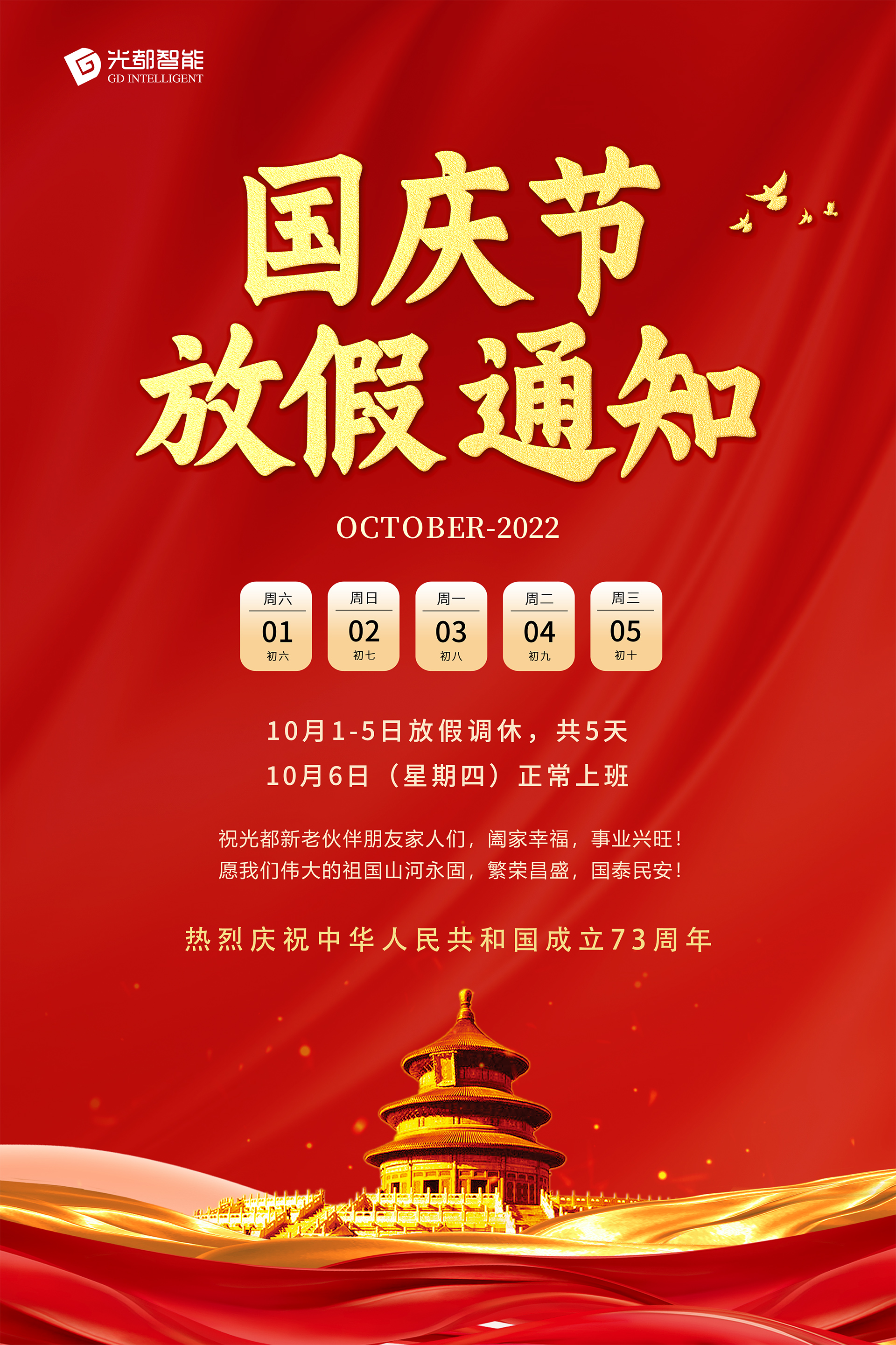 温馨提示:光都照明/光都智能/光都光电,公司及工厂统一调休放假5天(10月1-5日),10月6日(星期四)全部恢复上班。