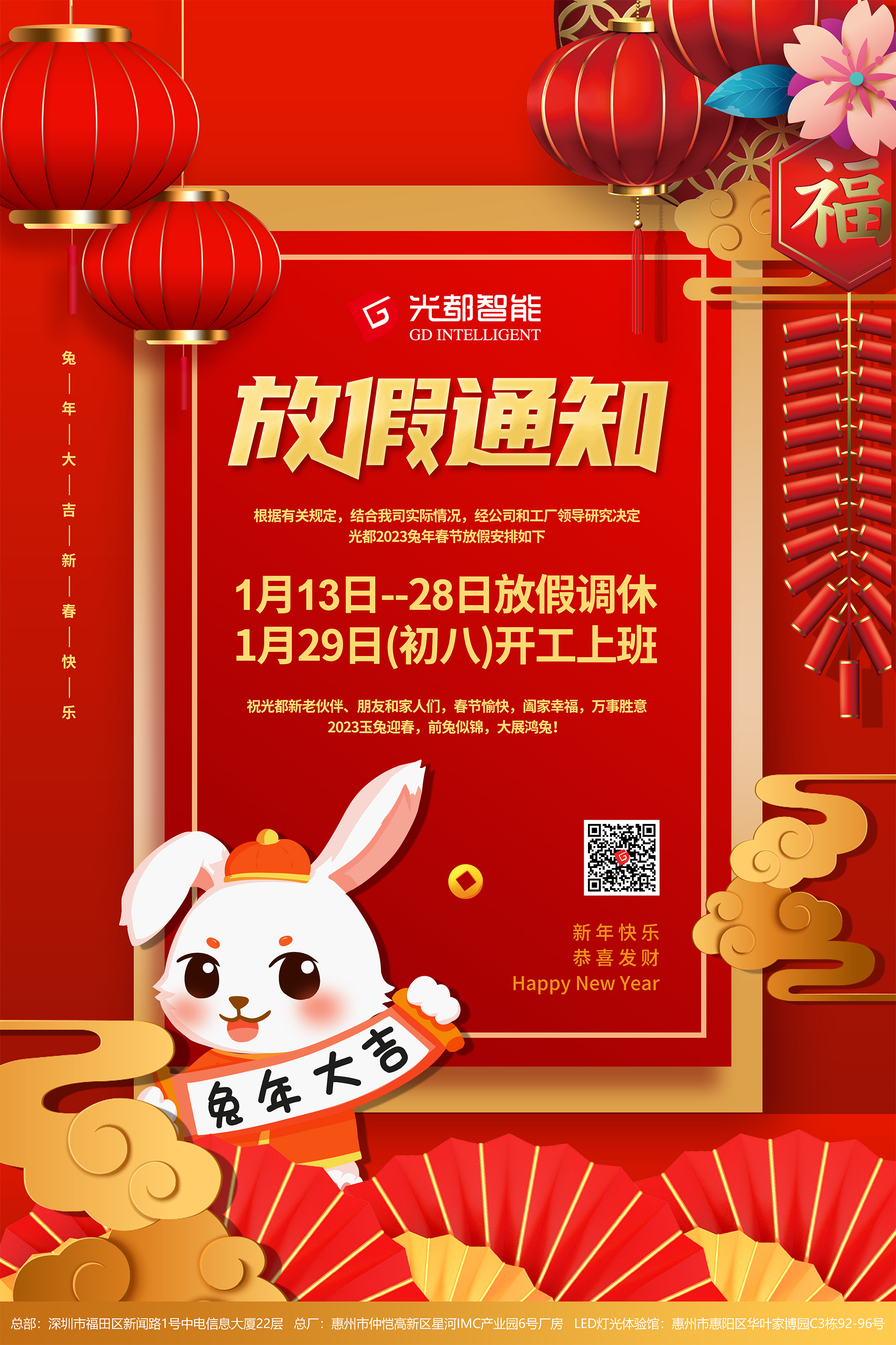 光都2023兔年春节放假通知:2023年1月13-28日放假调休,1月29日(初八)开工。2022感谢相伴,感恩有您!恭祝新老伙伴朋友家人们,春节愉快,阖家幸福,万事胜意!2023玉兔迎春,前兔是锦,大展鸿兔!