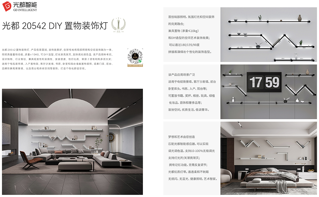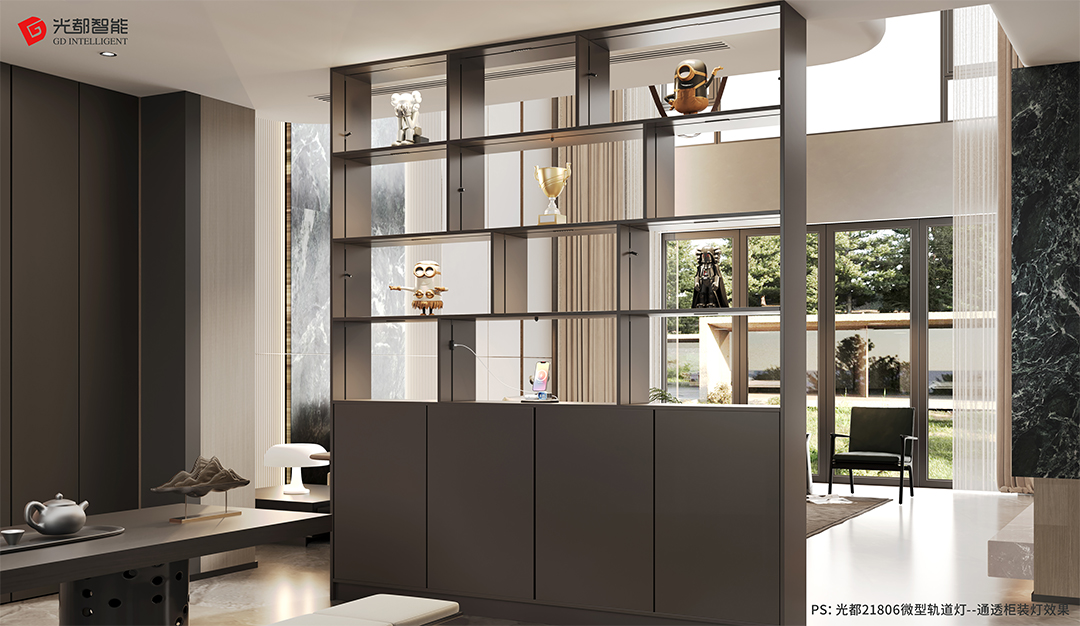 光都21806嵌入式微型轨道灯系柜类无主灯的创造性应用,通过嵌入12*12微型导电轨道,将可调角度的筒射灯,微型格珊灯和泛光灯按需要卡入轨道点亮,导电轨采用三芯线路方案,不分正负极,灯具可自由调换,内置手扫感应器控制开/关和调节灯光,可用L型转角接头和对接头构造不同的造型,巧妙艺术地玩转点/线光源,营造新颖非凡的柜灯效果,可广泛应用于通透柜、橱窗柜、开放柜、装饰柜、餐边柜、茶室、电竞房和手办空间等场景,极大地丰富了灯光内涵和提升情绪价值。