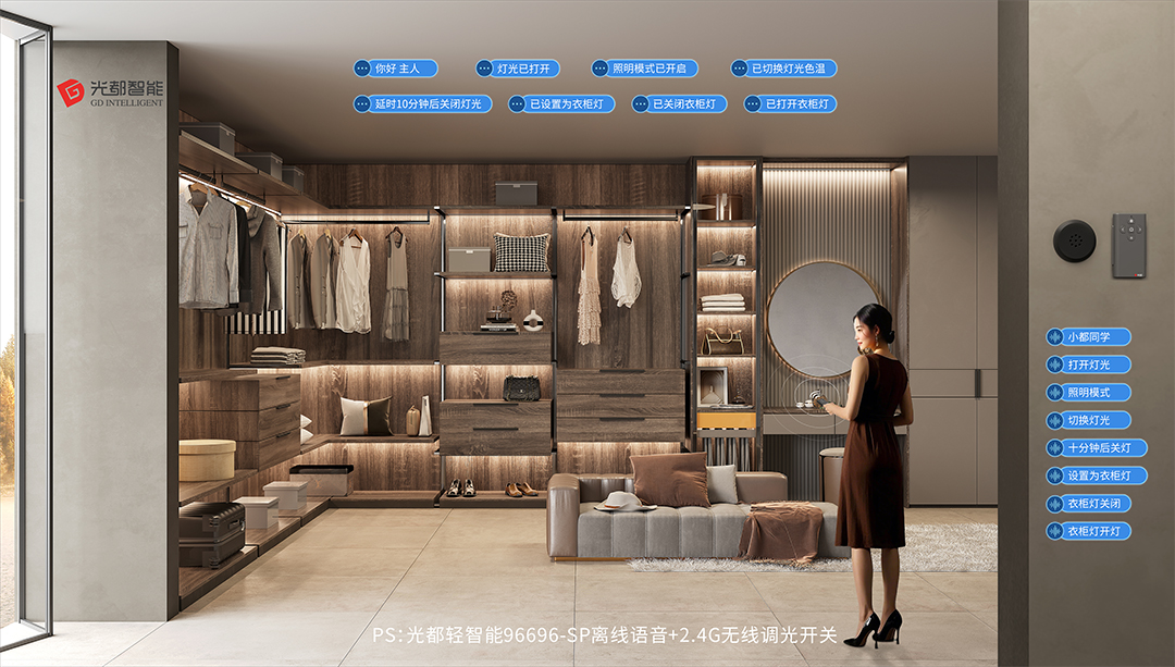 光都离线语音开关SP系列属于轻智能家居应用,创新性地将语音控制与有线触摸调光、2.4G无线感应调光和无线调光调色温完美融合,离线语音控制无需上网,无需APP,无需对码,通电即用,控制距离≤5M,支持定制唤醒词,支持按场景设置灯光名称,支持集控和分控。该系列产品有三款:离线语音+触摸调光开关,离线语音+无线感应调光开关和离线语音调光调色温开关,让用户解放双手,随心掌控,少量的成本增加,享受到便捷的智能灯光体验,极大地丰富了柜灯的呈现,提升客户的竞争力。