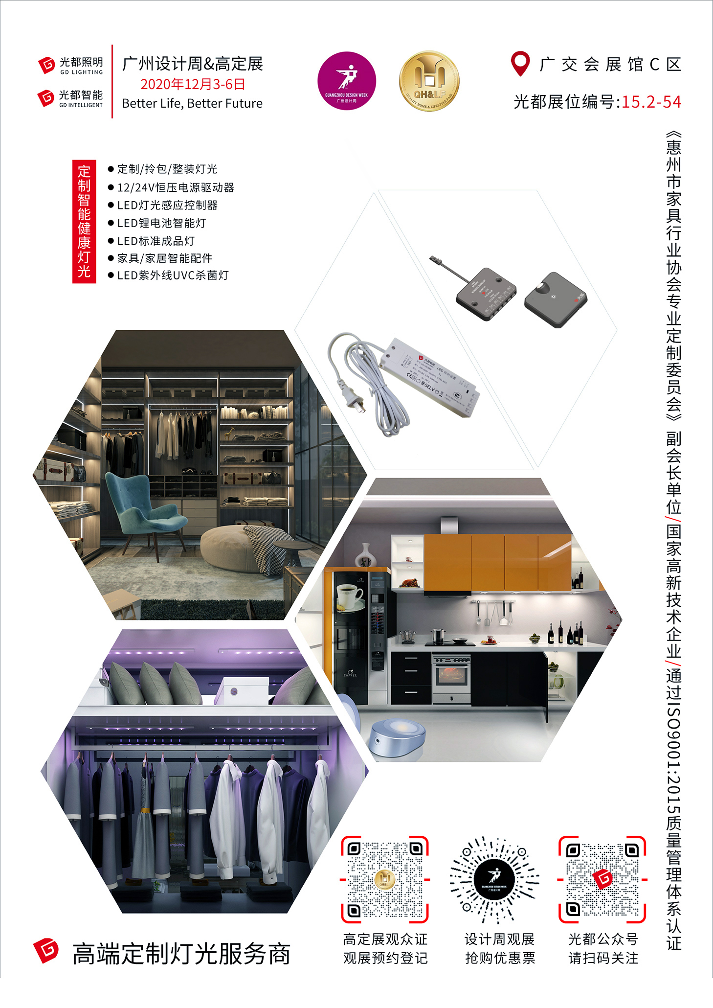 由中国对外贸易广州展览总公司和中居联会展联手打造的2020广州国际高端定制生活方式展览会(高定展)暨第十二届中国定制家居供应链微洽展(微洽展),于2020年12月4-6日在广交会展馆C区隆重举办;光都受邀携旗下光都照明和光都智能组团参展;届时,一年一度中国最高规格的家居设计嘉年华2020广州设计周也将于12月3-6日在保利世贸博览馆与广州国际采购中心同期缤纷上演;光都诚邀广大伙伴朋友和全球家居人12月4-6日莅临广交会C区15.2馆54号展厅参观指导,品鉴接洽,合作共赢!光都坚持客户需求为导向,客户价值为中心;努力构建诚信合作,资源共享,携手共赢生态圈;致力于合作伙伴和广大用户“智享光世界”。