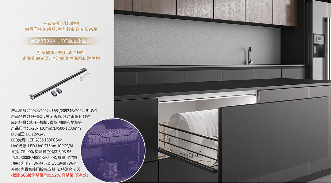 好灯光的定义:健康!经历过疫情三年的洗礼,人们把健康看的比任何时候都更为重要。光都20924-UVC抽屉杀菌灯,采用275nm专业UVC紫外线杀菌,通过SGS权威检测,杀菌率高达99.92%,达到了医疗级效果,真杀菌,真有效。适用于橱柜拉篮/调味篮/地柜收纳,以及鞋柜/衣帽间/浴室柜等场景。开门照明,关门灭灯并启动杀菌,延时杀菌10分钟(多次抽拉可累积杀菌时间),人在的时候不会杀菌,保证使用环境安全,确保对用户无害。高端定制好元素,健康家居好帮手!