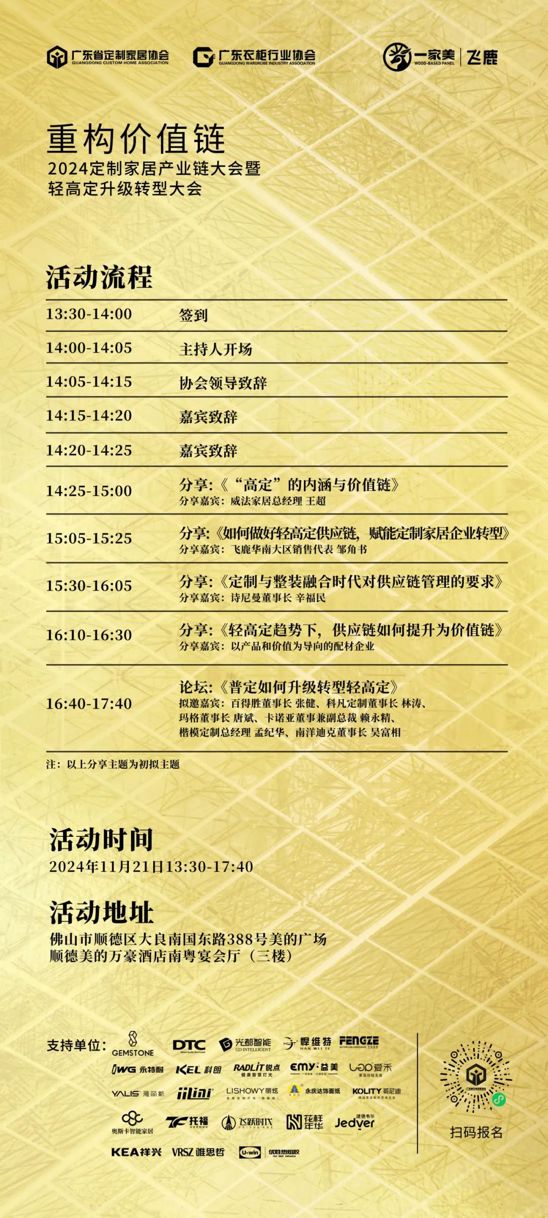 “重构价值链”——2024定制家居产业链大会暨轻高定升级转型大会将于11月21日在广东佛山顺德美的万豪酒店举行。